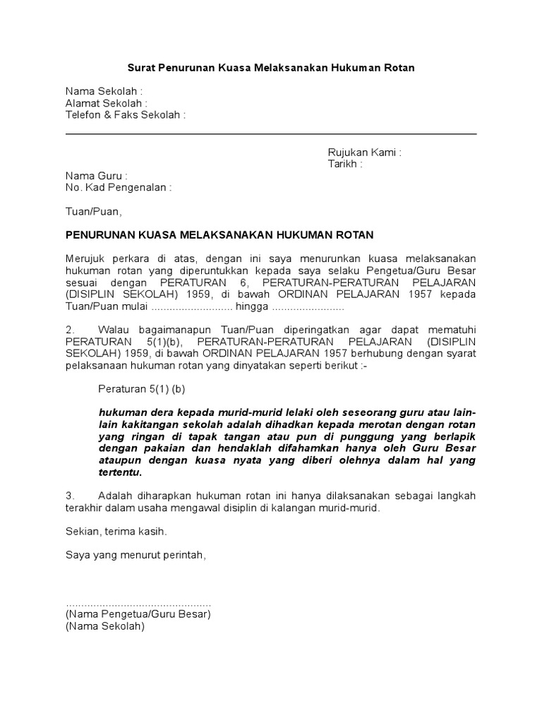 Surat Penurunan Kuasa Melaksanakan Hukuman Rotan Pdf